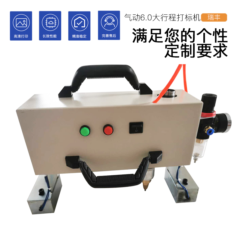 工作台采用精密模具铸造,64细分驱动器,进口直线导轨、高精度步进电机可靠性高。应用范围:适合各种金属和非金属平面方向自动打标。 打标机构成: 基本配置由计算机、显示器、控制箱、打标机主机组成。 1主机:主机包括二维、Z轴、打标头、空气调压过滤器。 a二维是步进驱动的X、Y运动机构,在电脑和控制器的控制下按字符和图形的轨迹运动; b、Z轴是手动升降机构,用于调整针头和工件的距离; c、打标头是针头振动机构,包括钢针、弹簧、密封圈; d、空气调压过滤器用于供应使钢针振动的气压,并可调整钢针的冲击力。